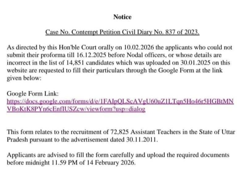 उत्तर प्रदेश में 72,825 सहायक शिक्षकों की भर्ती से संबंधित अवमानना याचिका के क्रम में अभ्यर्थियों के लिए महत्वपूर्ण नोटिस जारी किया गया है। संबंधित प्राधिकरण द्वारा स्पष्ट किया गया है कि जिन अभ्यर्थियों ने 16 दिसंबर 2025 तक अपना प्रोफॉर्मा जमा नहीं किया है अथवा जिनके विवरण में त्रुटि पाई गई है, उन्हें पुनः निर्धारित प्रक्रिया का पालन करना अनिवार्य होगा।