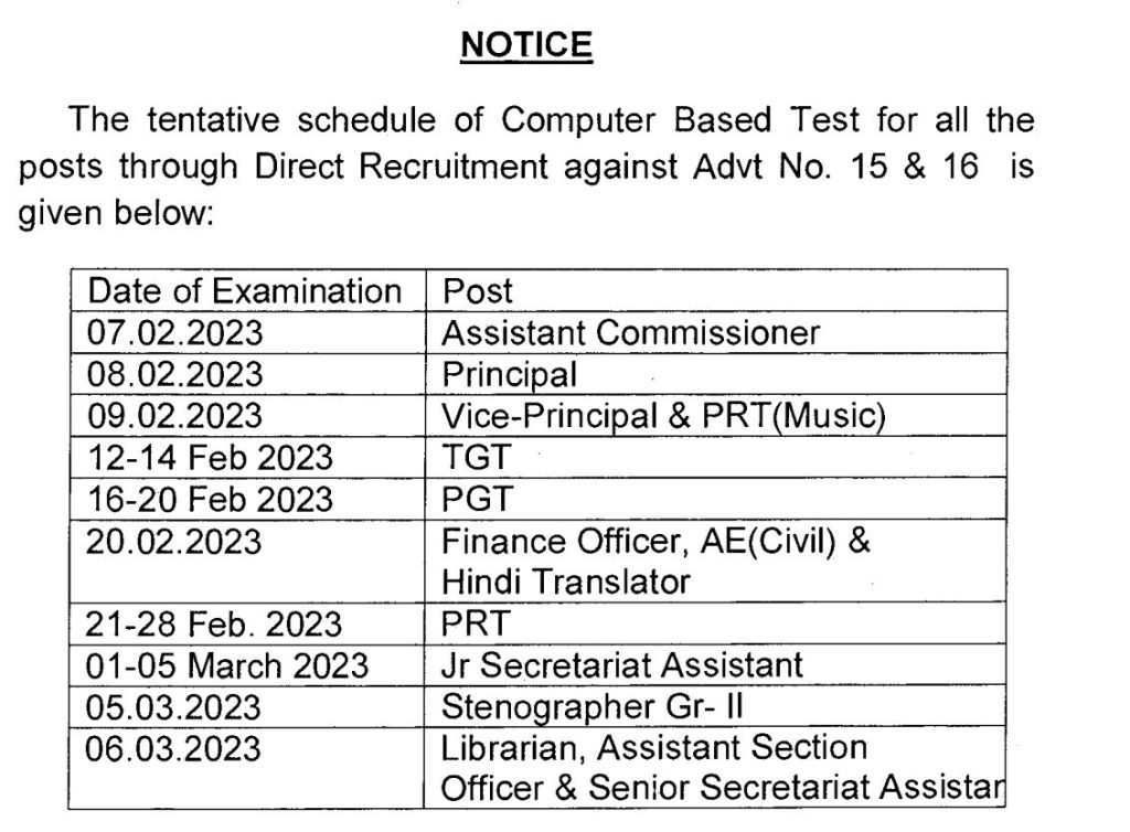 केन्द्रीय विद्यालय संगठन द्वारा विज्ञापन संख्या 15 और 16 में विज्ञापित सभी पदो के लिए डेट शीट जारी कर दी गयी है. सभी पदो के लिए डेट शीट की पूरी जानकारी 20 जनवरी 2023 से आफिसिलय वेबसाईट पर उपलब्ध करा दी गयी है.