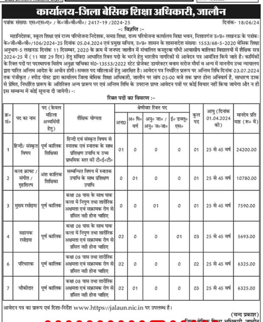कस्तूरबा गांधी आवासीय बालिका विद्यालय परिसर में समय समय पर विभिन्न केन्द्रो (जनपदों से भर्ती आती रहती है) इसी क्रम में जालौन जनपद से शैक्षिक सत्र 2024-25 हेतु (11 माह 29 दिन) हेतु संविदा आधारित (कान्ट्रैक्ट बेस) रिक्त पदों को भरने के लिए भारतीय नागरिकों से आवेदन आमंत्रित है.